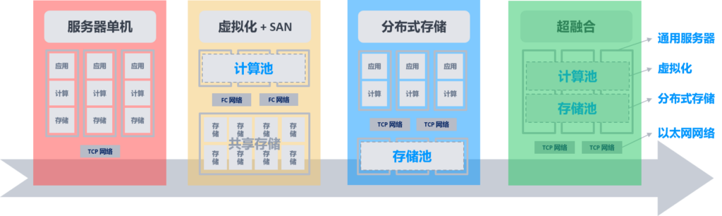 ●通过 软件定义的方式,将虚拟化和分布式存储 融合部署在 通用服务器上,统一管理 计算、存储、网络 等资源,实现 按需分配、弹性伸缩 的基础架构。