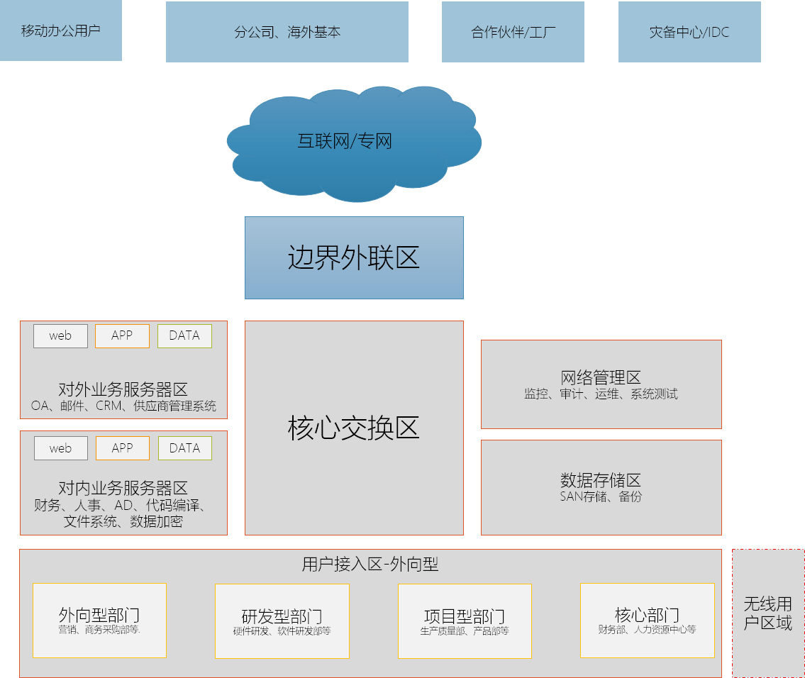 在网络架构搭建前期,对用户、业务划分不同的安全功能区域,沉入业务端去了解网络的业务属性、访问特点、流量流向等,对后期的IP地址规划、流量规划、安全策略规划都非常有益处。
