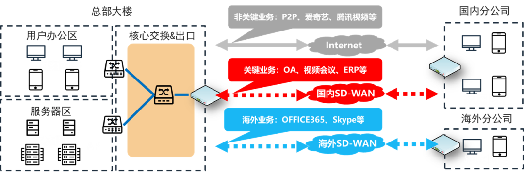 总部与分部分布广泛,IT业务紧密。业务访问需要高效与安全兼顾, IT运维需要统一管控